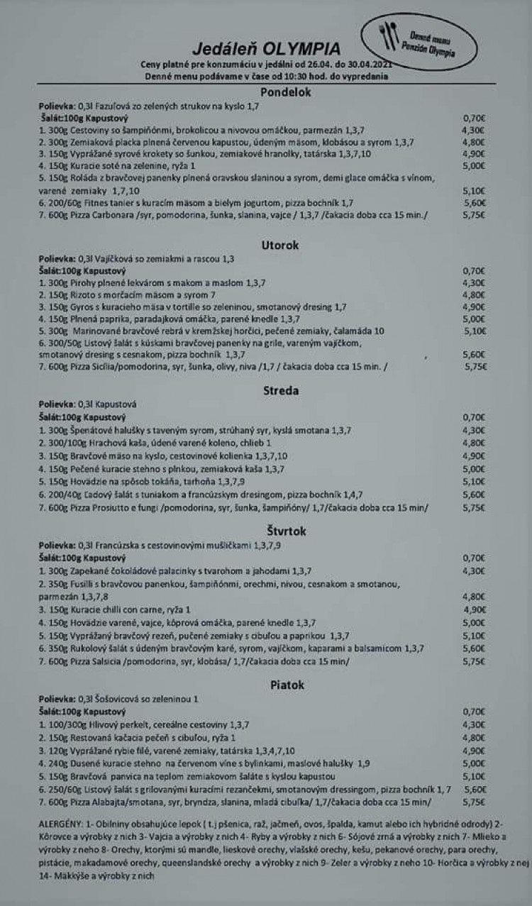 Alá-carte jedlá a chutná pizza v meste! Denné menu podávame v jedálni v čase od 10:30 hod. do vypredania Jedáleň je otvorená od 10:00 hod. do 22:00 hod. Cez víkendy od 11:00 hod. do 21:00 hod. Cena menu od 4,00€ 100g Malý šalátik k menu za 0,50€ Na pizzu z denného menu sa čaká cca 15 minút.