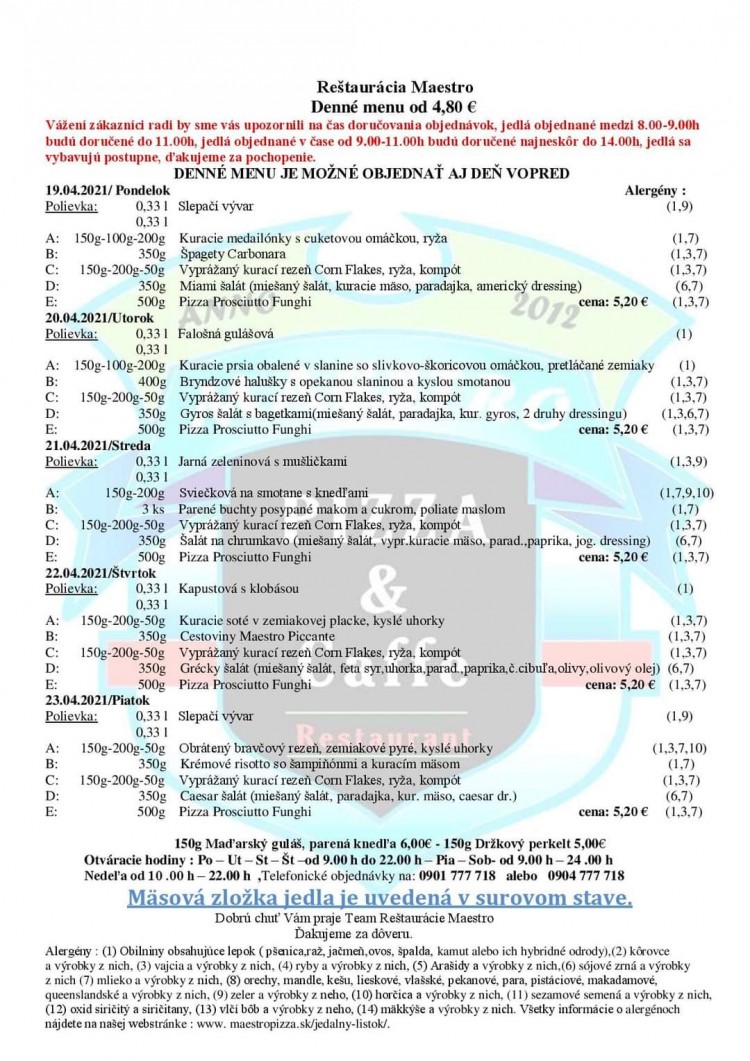 Vitajte na stránkach donáškovej služby Maestropizza a Jedlá. Radi Vás privítame v príjemnom prostredí našej reštaurácie. Možnosť firemných večierkov, osláv, výročí, team buildingu a iných podujatí s kapacitou do 50 osôb. V našej ponuke nájdete denné menu, minútky, pizze, cestoviny, šaláty, špeciality a dezerty.